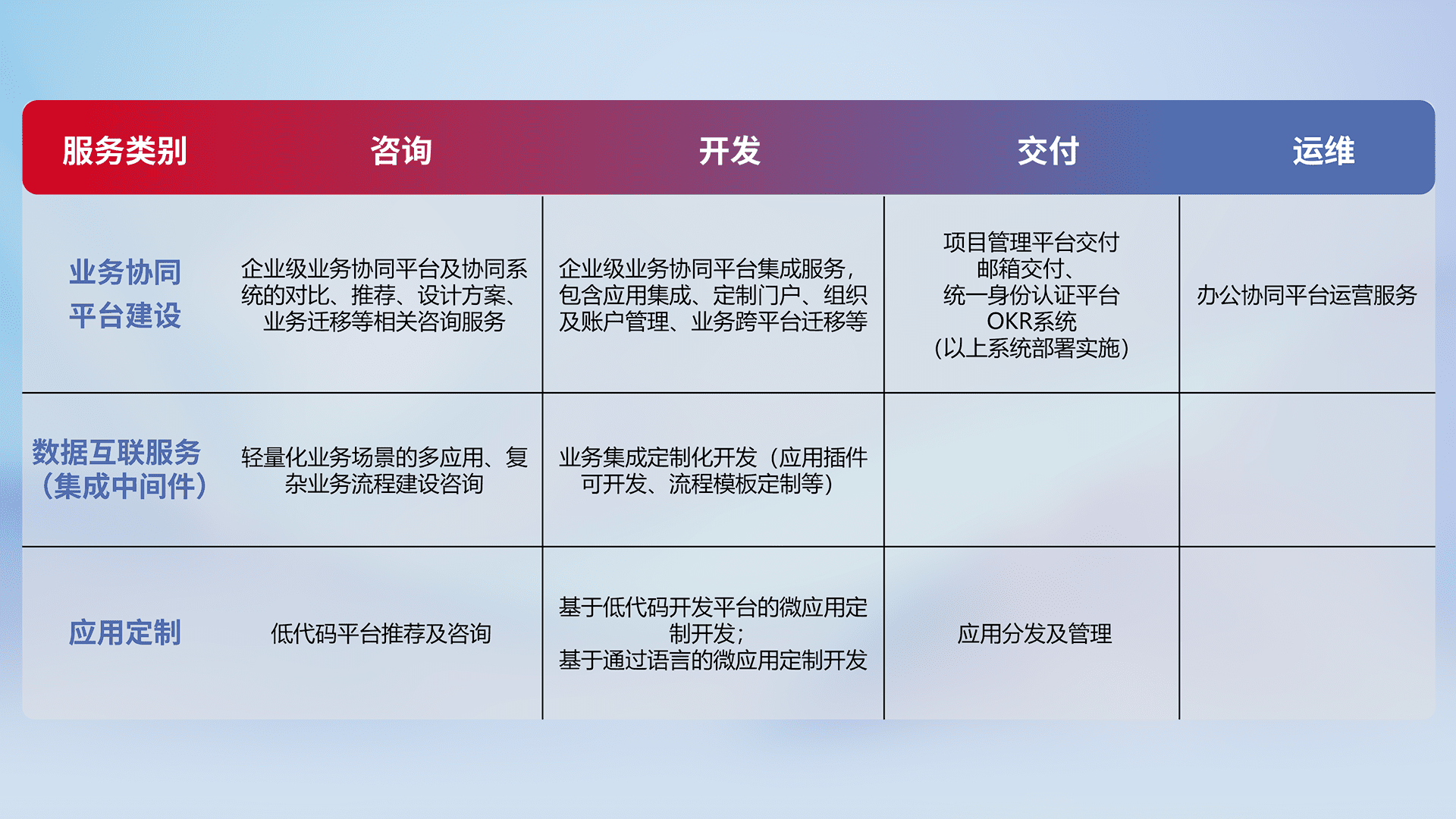 针对钉钉、、、企微、、、、IDaas等平台级产品提供产品的规划、、方案、、、、交付、、、、定制化开发等服务,,实现如统一协同办公、、、、智能客户服务、、、、混合会议管理、、、智能数据查询、、、、等业务场景,,实现数字化转型。。。